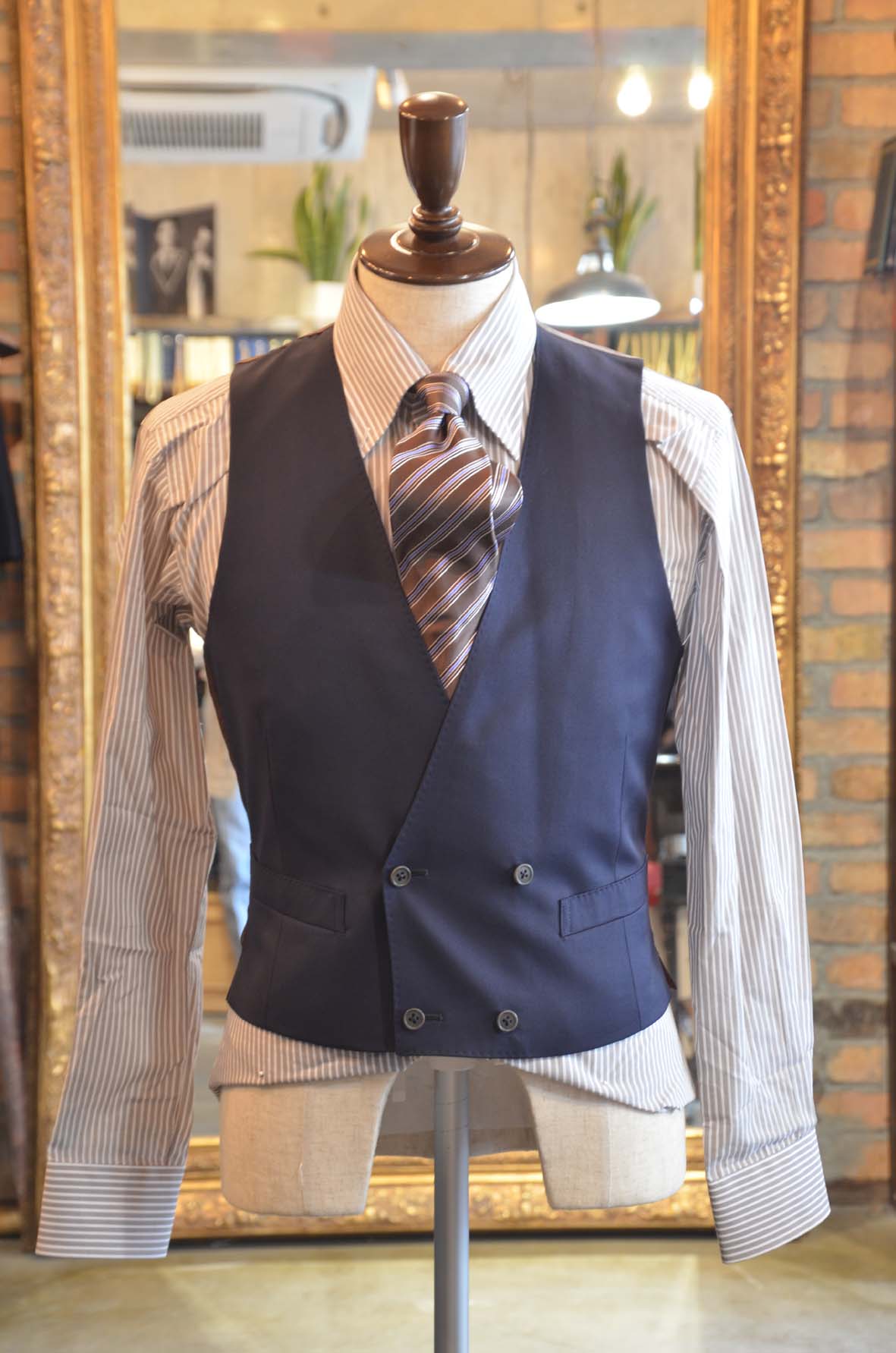 普段、お店ではなかなかお目にかからない前身がダブルのベスト。 ドレッシーかつクラシックなデザインは洋服好きにはたまらない一品ですね。上質なネイビー無地でのお仕立からは、ドレッシーさが溢れ出しております。
