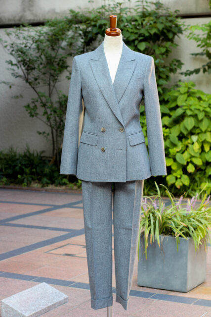 フランネルの起毛感は温かみのある柔らかさがあり、スッキリとしたスーツの形にする事で、落ち着きの中に上品さを感じさせる、冬の装いにぴったりの一着です。グレーフランネルといえば、“男性的”な印象を思い浮かべる方も多いかもしれません。しかし写真のようにパンツを細身のラインに仕上げることで、全体をすっきりとまとめ、女性らしい繊細さを引き出せます。細身のすっきりしたシルエットとダブルジャケットの華やかさが、大人の余裕と色香をほんのり感じさせるバランスに仕上げました。